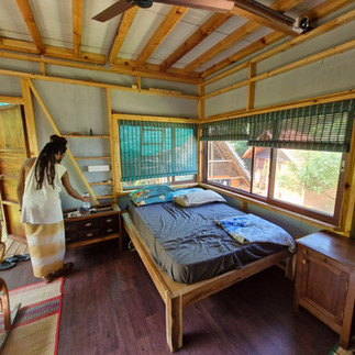 MATERIALS: Shaved Acacia auriculiformis logs as the six supporting pillars of the house. Local hardwoods balcony flooring, staircase, and railings. Pine wood floor and roof structure and internal flooring planks.